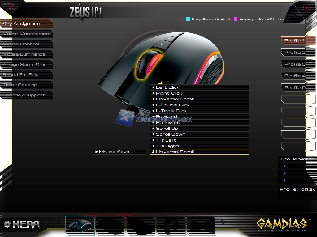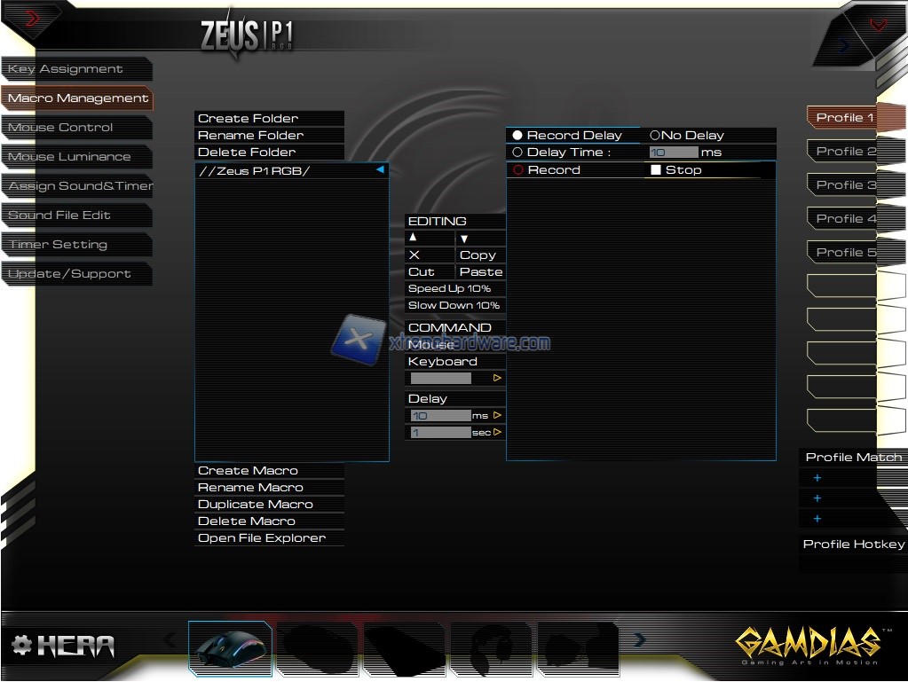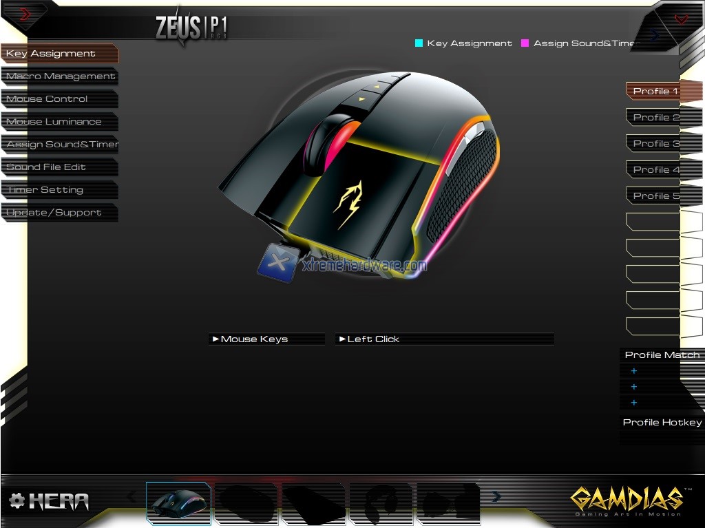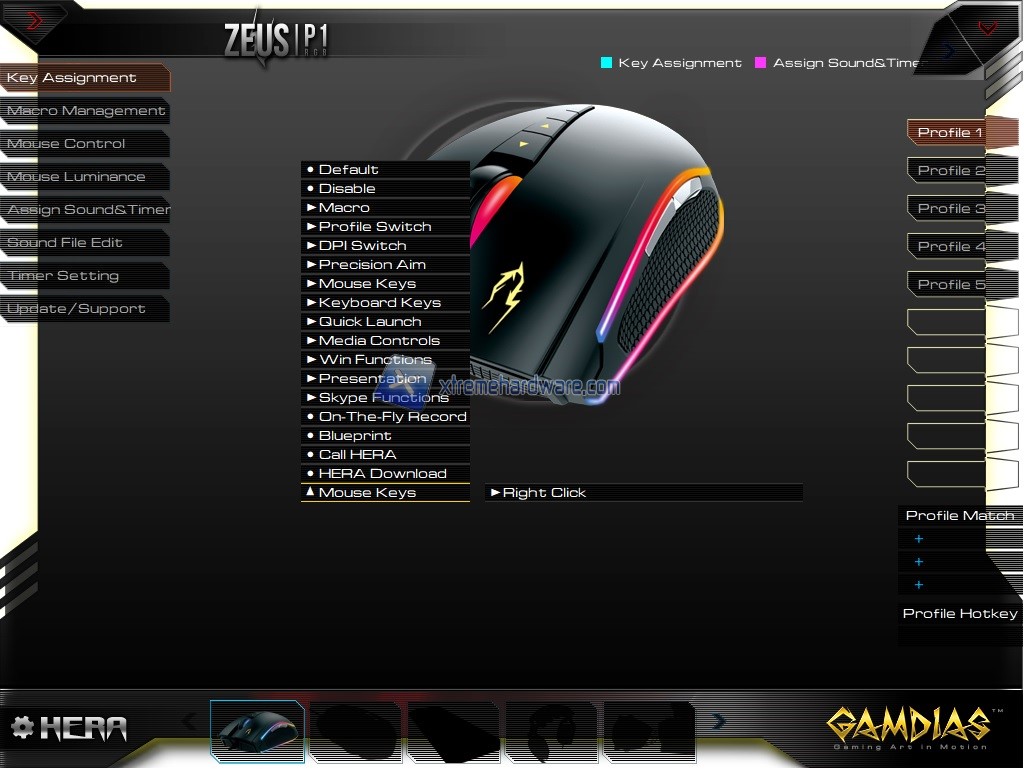 A sinistra avremo 8 Menù di personalizzazione mentre a destra ben 5 profili in cui creare e salvare le nostre personalizzazioni. Nella parte centrale basse troveremo dei riquadri che andranno a ‘’completarsi’’ all’aggiunta di altre periferiche Gamdias supportate dal software HERA.