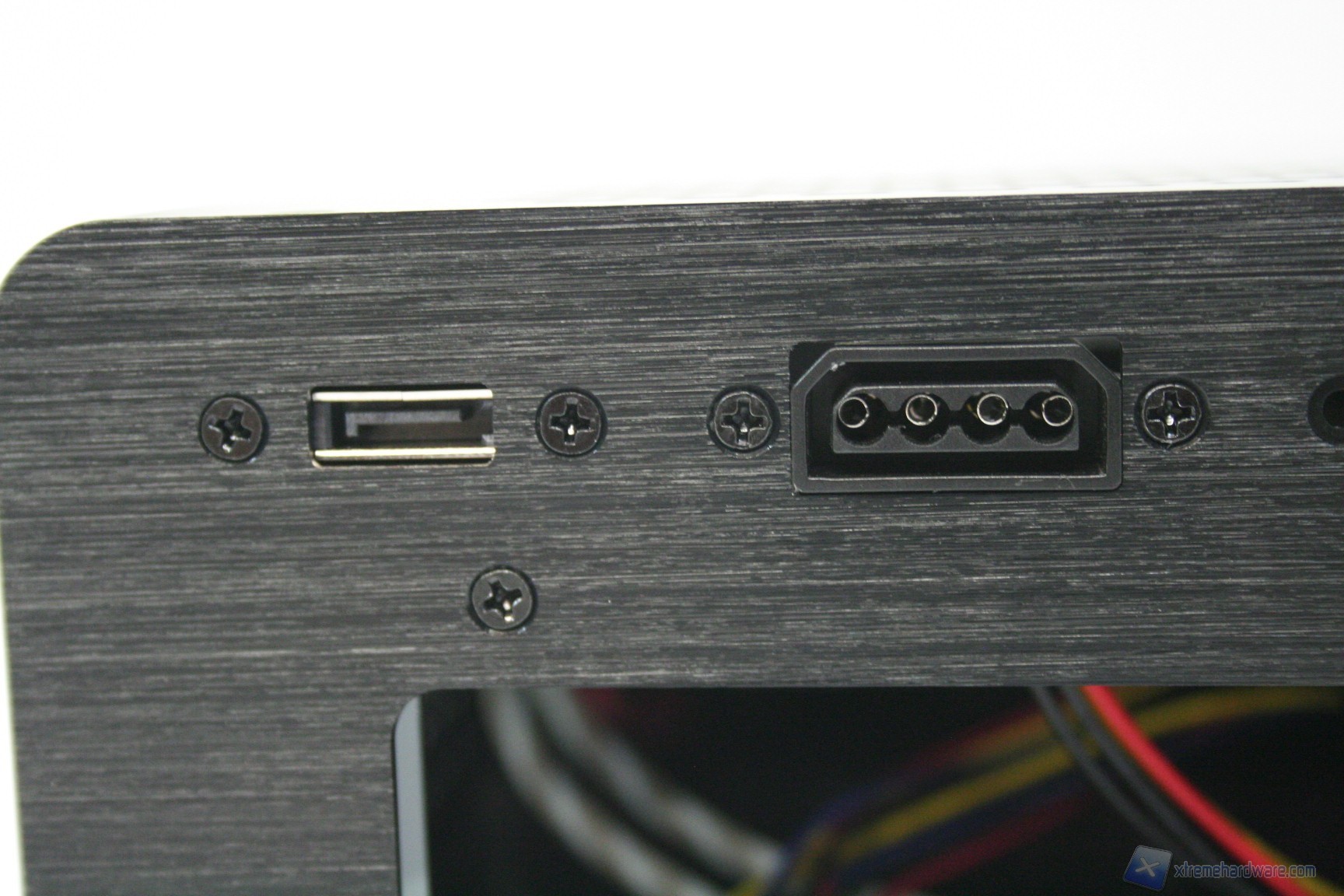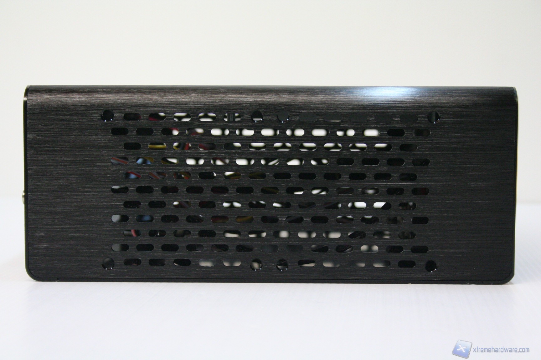 La parte frontale nell’ITEI5 è caratterizzata da un frontalino spesso 2mm in alluminio con finitura spazzolata, che troviamo sull’intera struttura. Il pulsante di accensione si trova al centro, insieme a due ingressi USB 2.0, con l’entrata per il microfono e l’audio. Purtroppo non c’è il supporto all’ultimo standard USB 3.0, diventato ormai un must per il collegamento di periferiche di archiviazione ad alta velocità. Nella parte laterale, come si vede dalle fotografie, c’è un taglio molto simile a quello del Silverstone TJ04-Evo, il che comporta una finitura semplicemente eccelsa, molto robusta ed elegante.